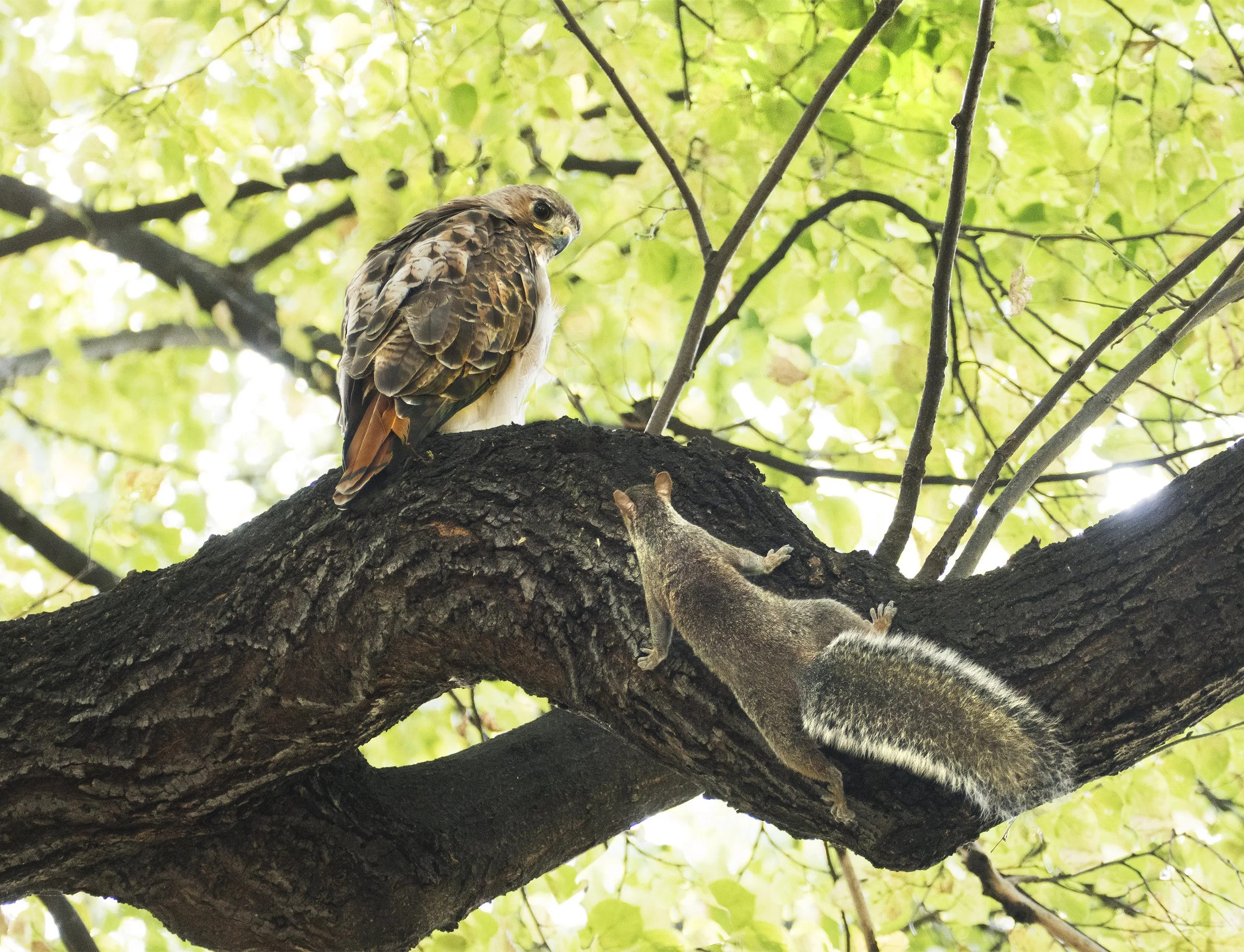 The larger and bulkier Red-tailed is no doubt a squirrel-hunting pro in our local forest preserves (and indeed, it has been used in falconry for hunting squirrels and rabbits), but it doesn’t have the maneuverability of the Cooper’s in the closer confines of Chicago neighborhoods - or around patio birdfeeder smörgåsbords as this stunning, slow motion video of a Cooper’s Hawk successfully nabbing a meal (or two) shows. Local Red-tailed Hawks may stick to more open, park-like areas, or along our expressways, perched on a utility pole.