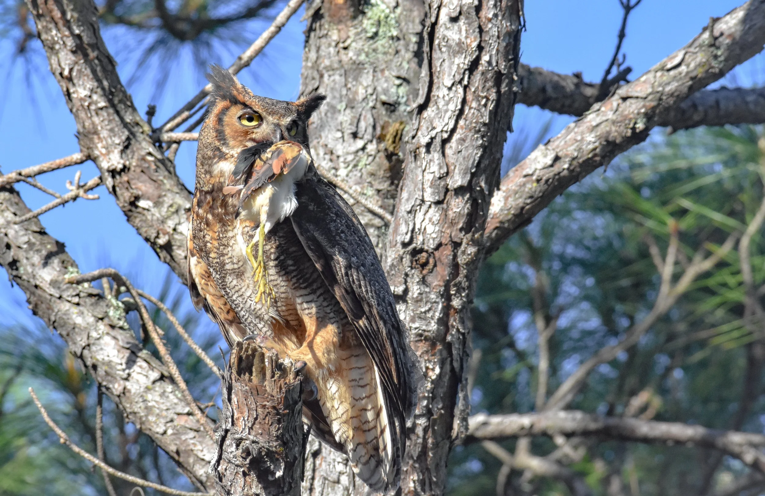 Great-horned Owl with the remains of a Least Bitten in its beak. Photo by Bob Quarles.